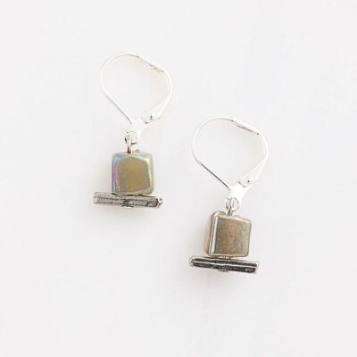 スクエア型のガラスビーズとピューターパーツを組み合わせた、シンプルで小さなイヤリング。